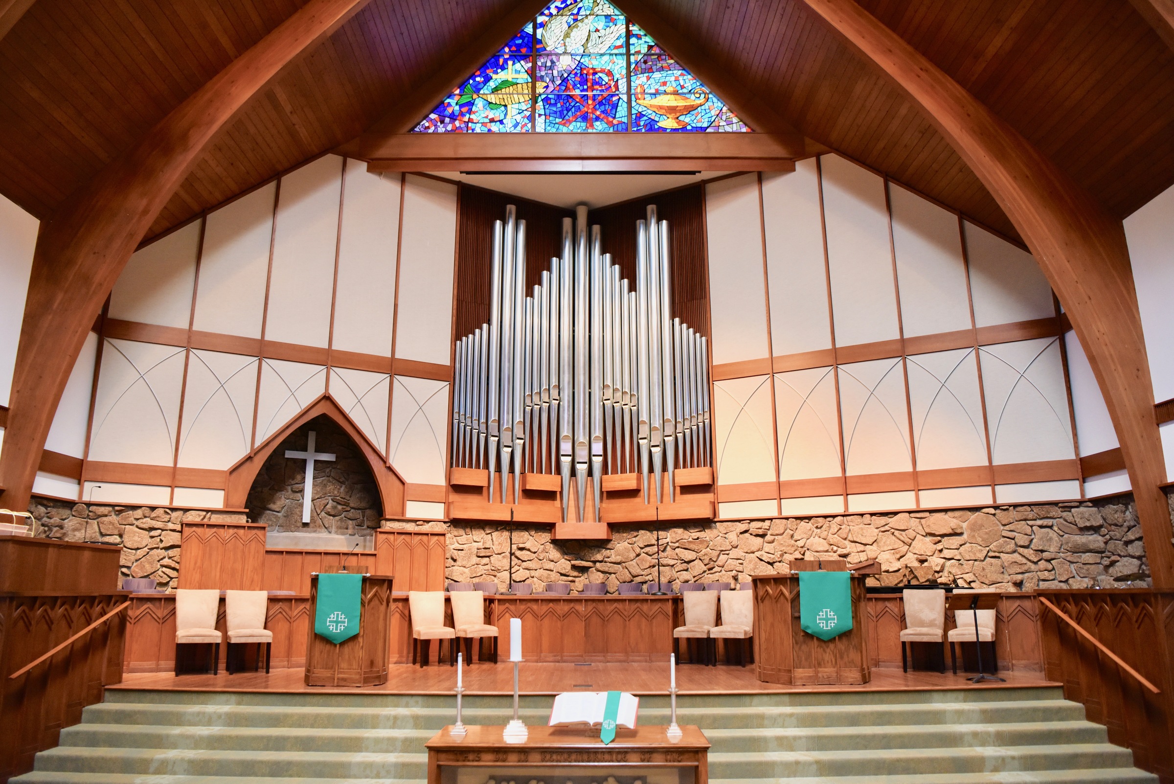 The organ installation was under the direction of Morel and Associates, Inc. of Denver. A new 16’ Principal façade was included in the design; console control systems were upgraded, and an antiphonal division was placed in the rear gallery.