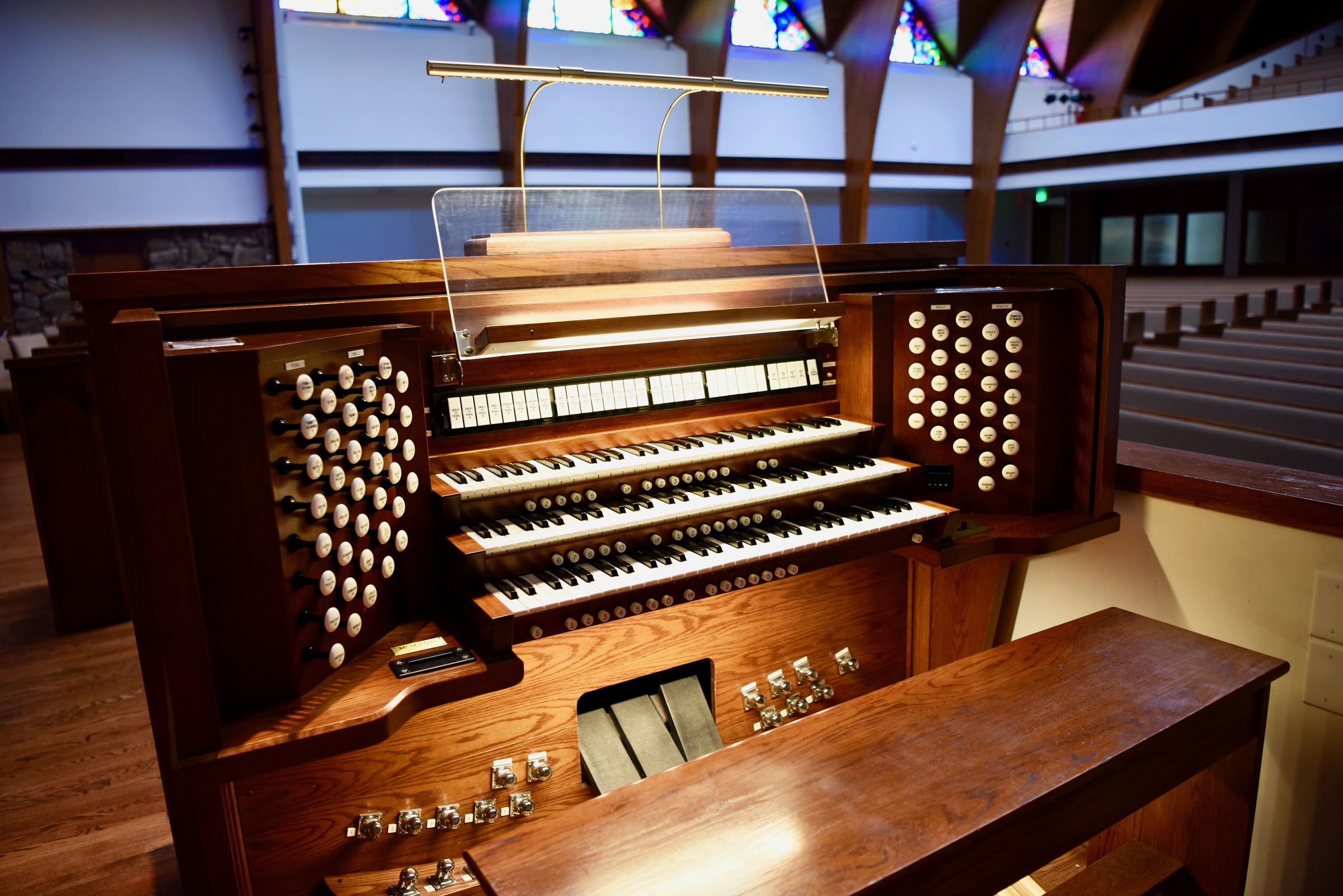 The forty-two rank, three-manual 1985 pipe organ was built by the Charles W. McManis Company of Kansas City, Kansas. It was purchased by Calvary Baptist Church in 2010, when it became available for sale from University Hills Baptist Church, located just a few miles away from Calvary. Calvary’s existing 1970 McManis, which had served the congregation well for many years, was in dire need of refurbishing. The purchase of the 1985 instrument, which was in excellent condition, coincided with the Sacred Space renewal project, encompassing the entire sanctuary, that emerged at Calvary Baptist around the same time.